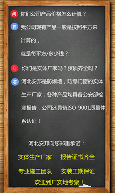 河北安邦安防是資質(zhì)齊全的防爆墻廠家,我公司擁有公安部核發(fā)的防爆墻檢測(cè)報(bào)告、ISO-9001質(zhì)量體系認(rèn)證。